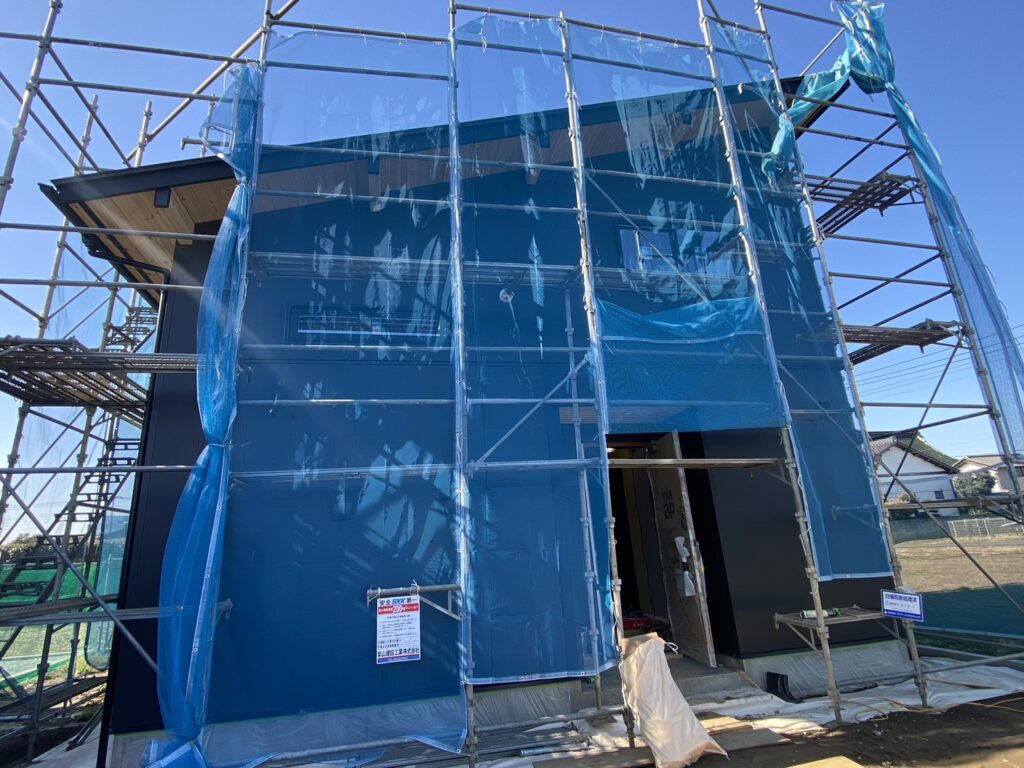 足場がかかっていて見えずらいですが、外壁・破風・サッシ・樋など、基本的にブラックで固めた統一感ある外観デザインです!
