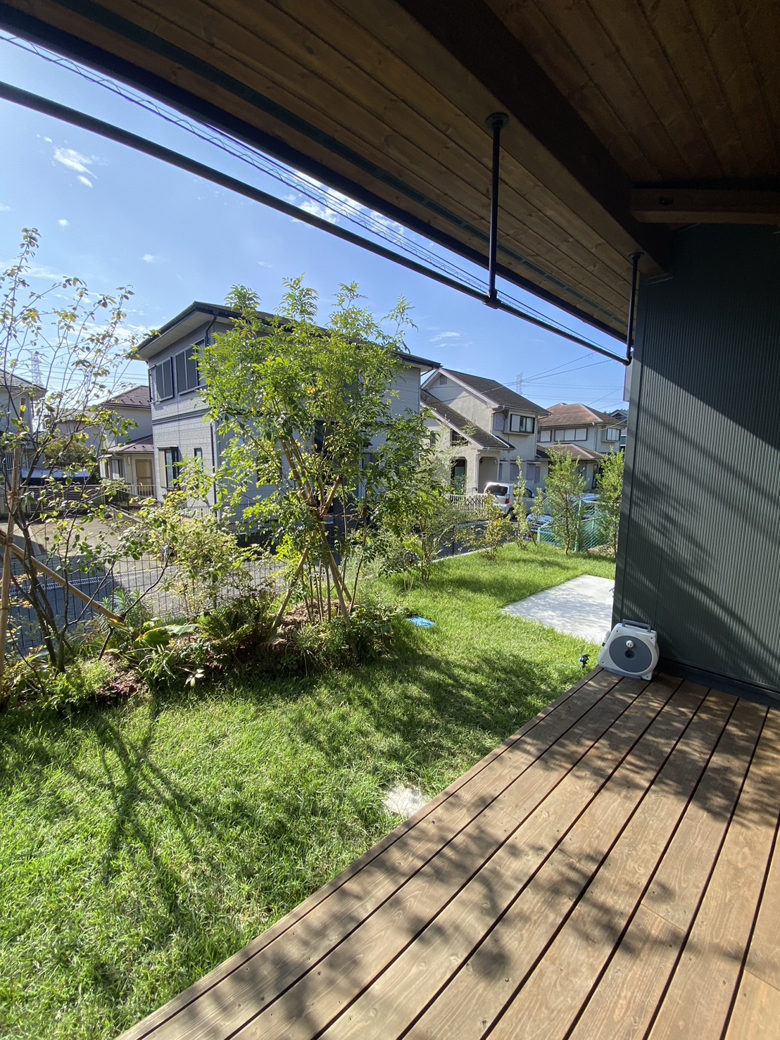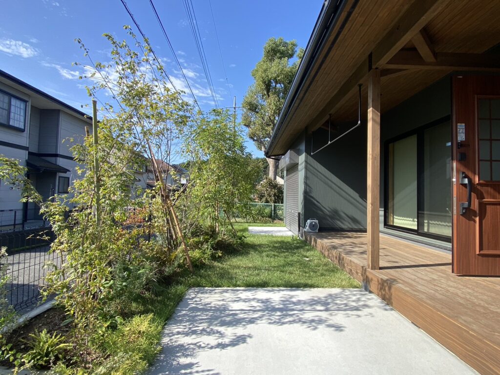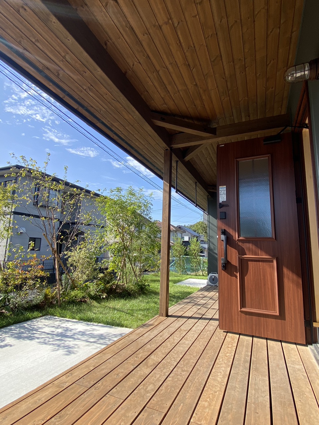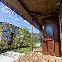 玄関前のウッドデッキは標準仕様。