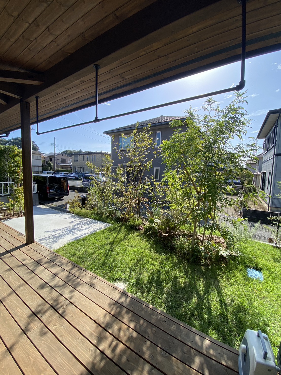 梁部分にはアイアンハンガーパイプ(W2,730×H570)を配置し、お外でも洗濯物を乾かせるようにデザインも損なわない仕様になりました。 -