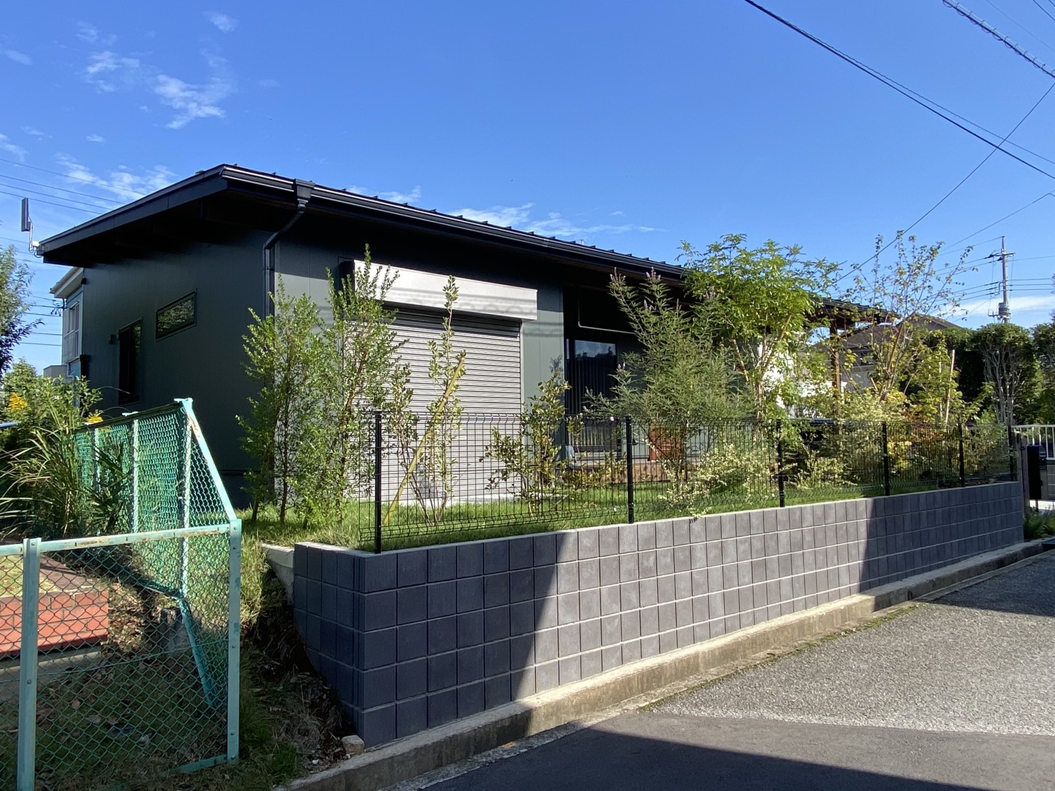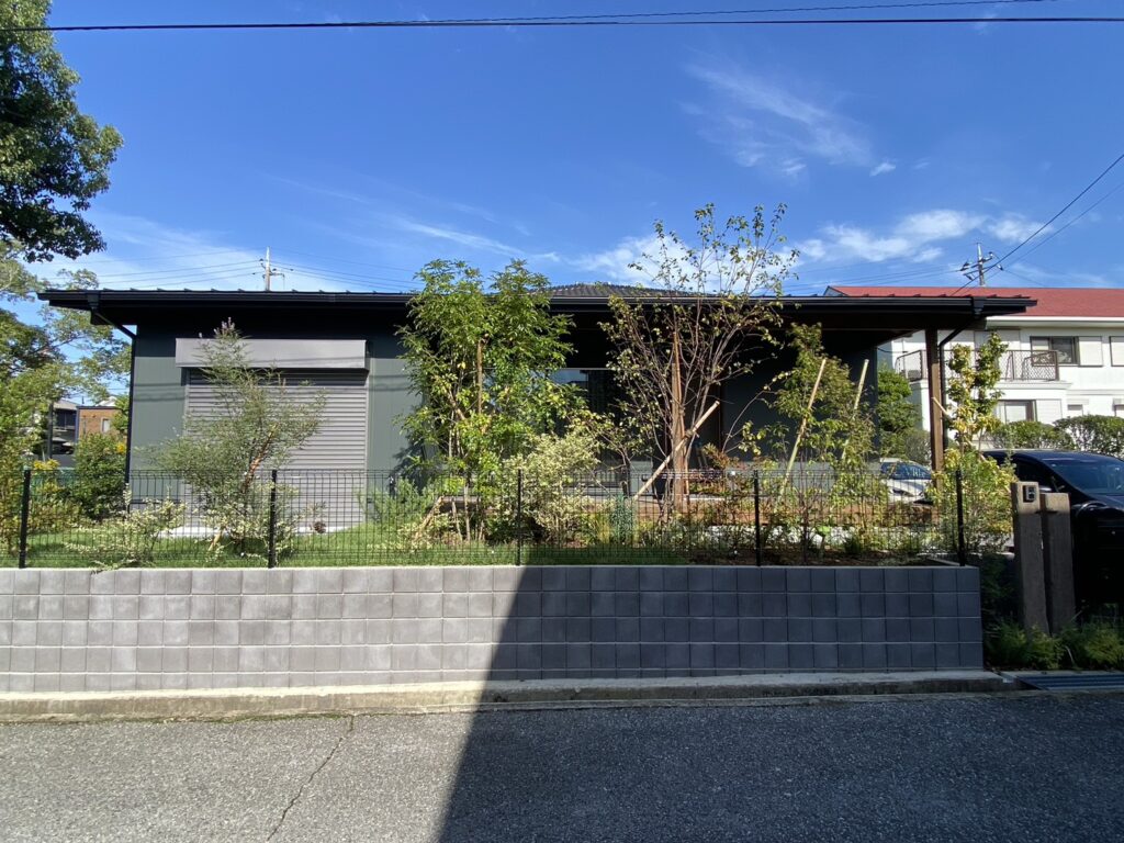 モスグリーンの外壁にオリーブ色の塗装をした落ち着きのある外観。