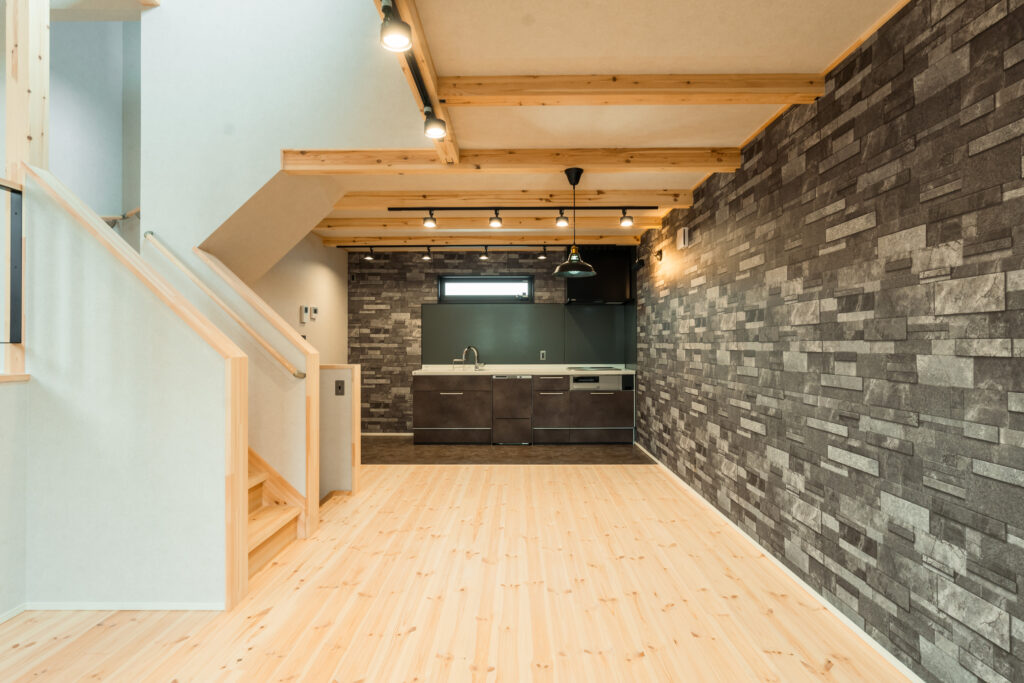 キッチンを巻き込むようにL型にレンガ調のアクセントクロスを採用していただき、まるでフォトスタジオのような空間に仕上がりました。